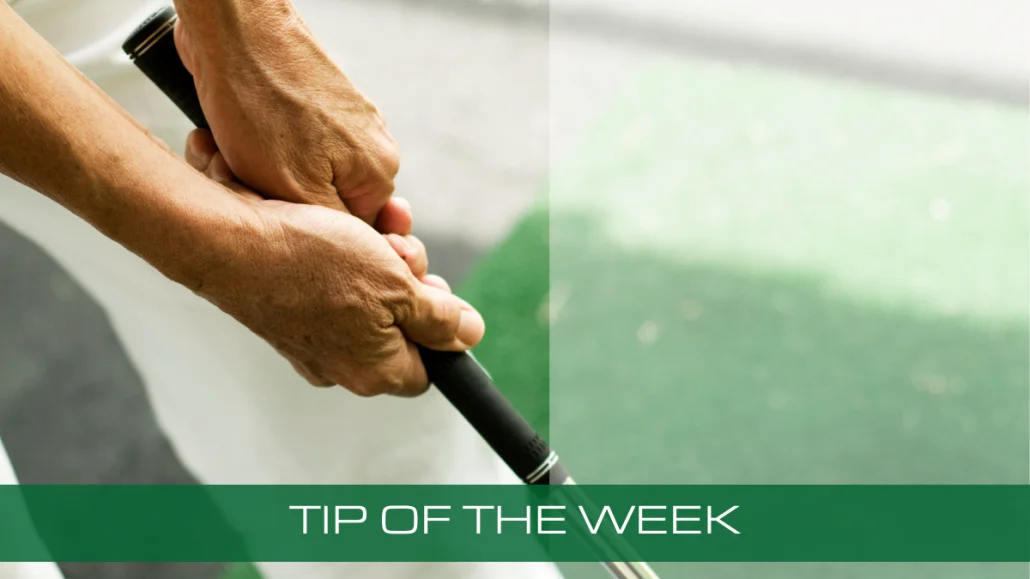 While the standard golf grip for a right-handed player is simply placing the right hand below the left, don’t be afraid to play around with what feels best. Some players will interlock their left index finger with their right pinky for a different feel while others do some kind of variation. One of the best tips we can give you is to play around with your golf grip until you find something that is comfortable and gives you control over the golf club and your swing.