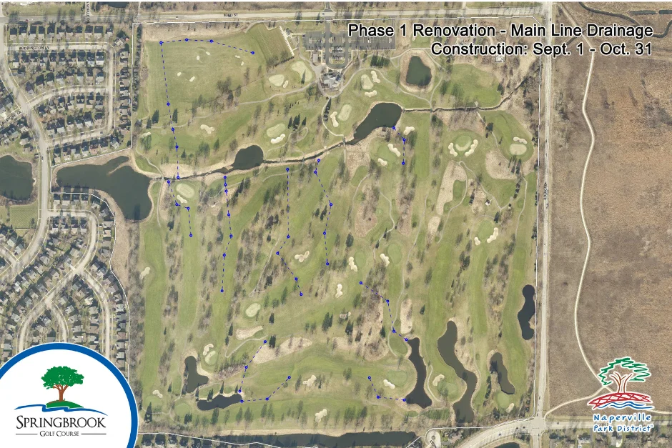 Project scope:  Beginning September 2021, Springbrook Golf Course will have the installation of mainline drainage throughout the golf course, which is the first phase of the two year renovation of the course.   Large drain tiles will be trenched in to help drain the problem areas, and new drainage basins will be installed to provide drainage for new features to be constructed in 2022, including the renovation of bunkers, green surrounds, and tees.
